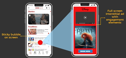 In-Screen Ads: Ads that appear as bubbles on the screen, often located at the bottom. When clicked, these ads expand into full-page interstitials.