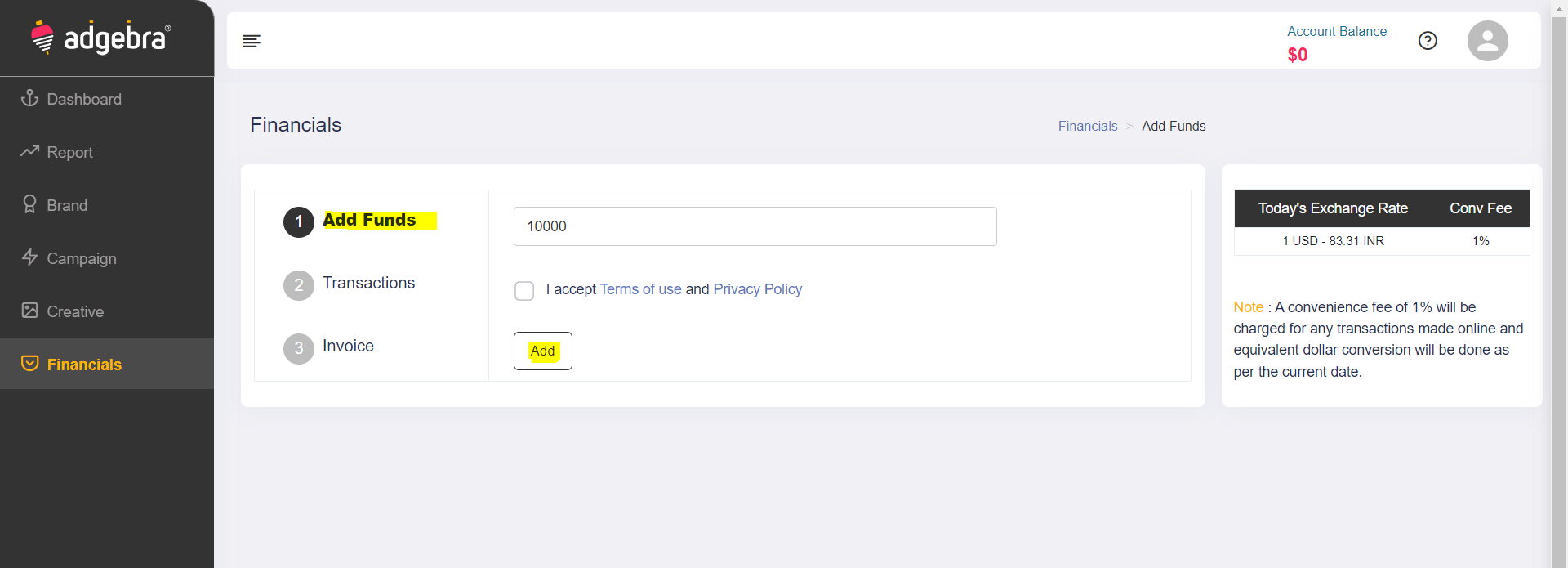 Financials > Add funds > Enter the amount Below is a screenshot of how to add payment in adgebra UI.